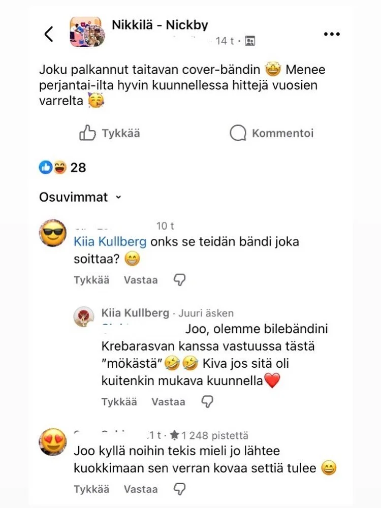 “Krebarasva oli esiintymässä häissä ja keikka oli aivan mahtava! Yleisö tanssi hullun lailla keikan aikana.